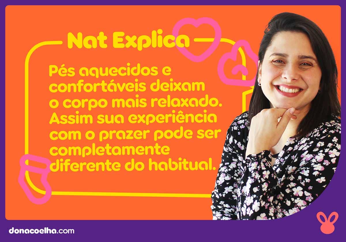 Quando você usa meias, manda uma mensagem pra o seu corpo de que ele não precisa “gastar energia” nos seus pezinhos porque você já cuidou disso. Então, ele vai melhorar a circulação sanguínea pra outras partes, como para o relaxamento da musculatura da vulva e ereção do pênis.