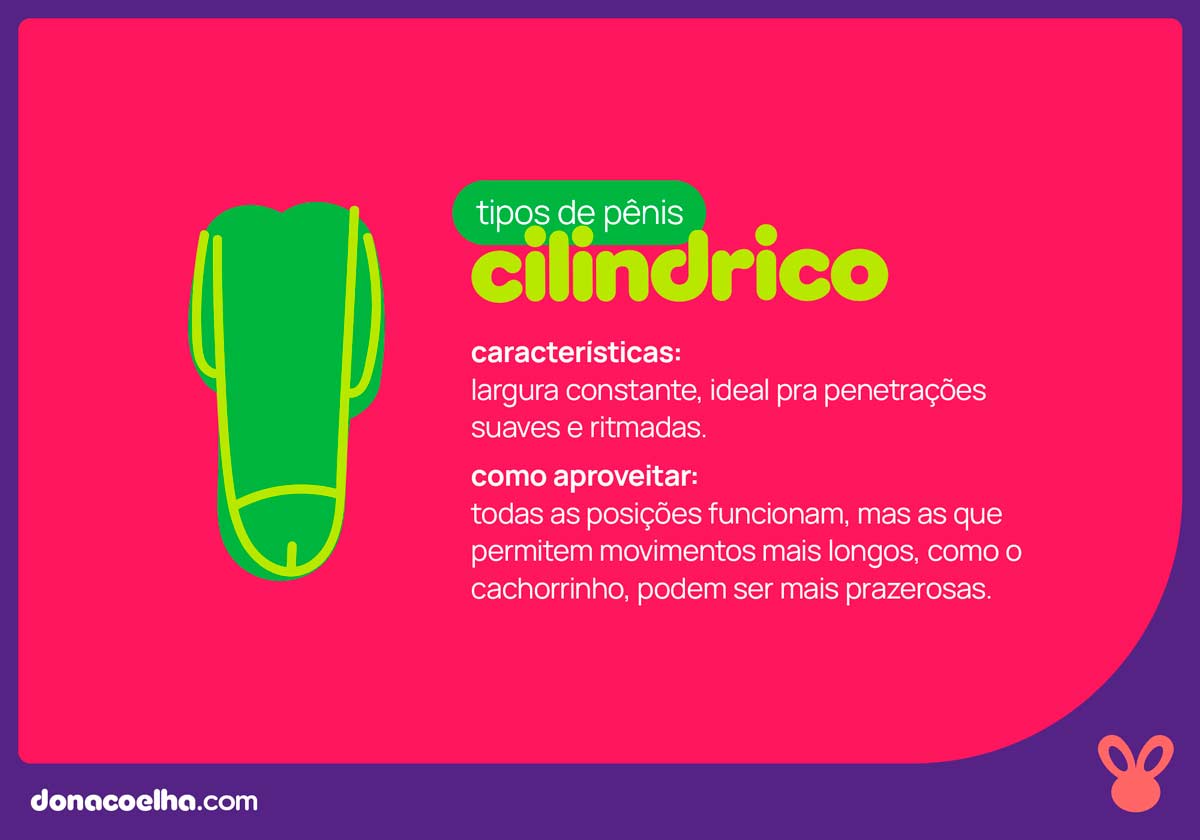 O pênis cilíndrico é aquele que tem uma largura uniforme do início ao fim, sem muitas diferenças entre a base e a glande. Esse formato é considerado super versátil e confortável.